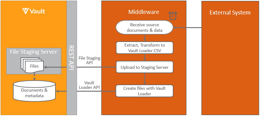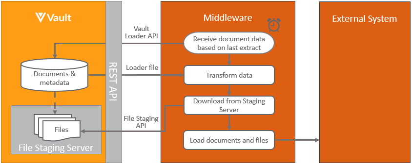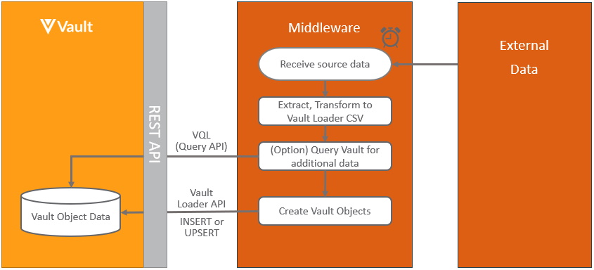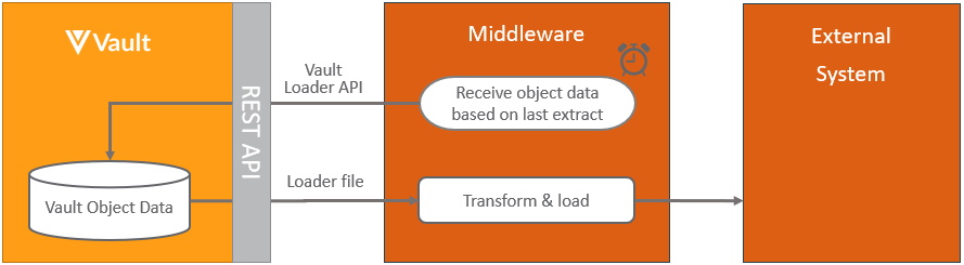 The pattern for integrating from either an external system or middleware system to Vault, is to use Vault API. Hosted integrations built this way can both push and pull data to and from Vault. Both bulk and asynchronous processing are supported, for best performance. Java based applications should utilize the Vault API Library (VAPIL):