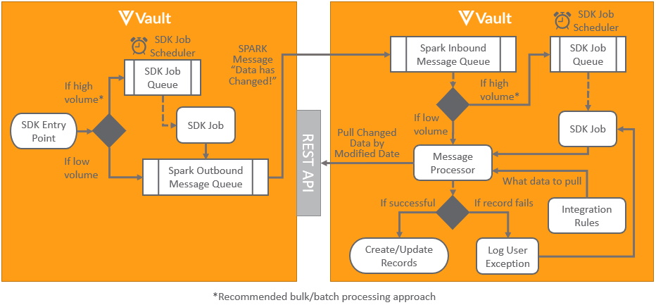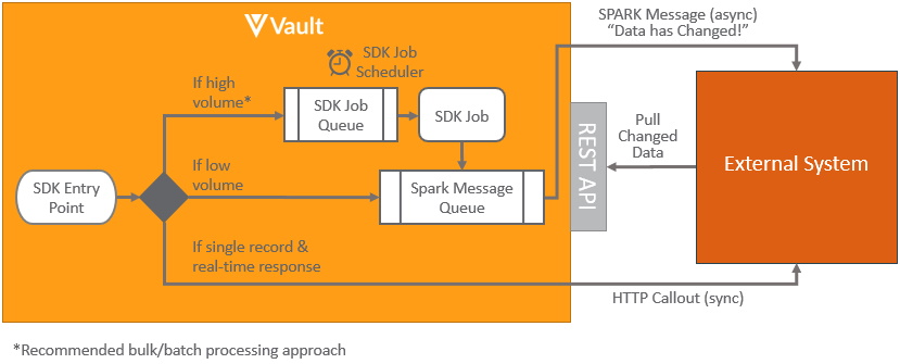 • Asynchronous: High Transactional Volume: For raw objects or objects that change frequently, it is most efficient to process documents in batches. Hence when a SDK entry point is triggered an SDK Job can be queued to indicate the external system needs to notify data has changed. Rather than send it immediately, having a delay (for instance every 5 minutes) means that if any other SDK entry points are triggered, there is no need to schedule another SDK Job, since one is already queued. Then when the delay period is reached, the external system can be notified that data has changed. This notification will be sent using an asynchronous Spark message. Learn more about Spark messaging. These messages are intended to be lightweight notifications rather than containing large payloads of what data has changed. The external system can then use Vault API to pull details of what has changed since the last time the data was pulled, using a VQL query restricted by last_modified_date__v or other VQL filters.