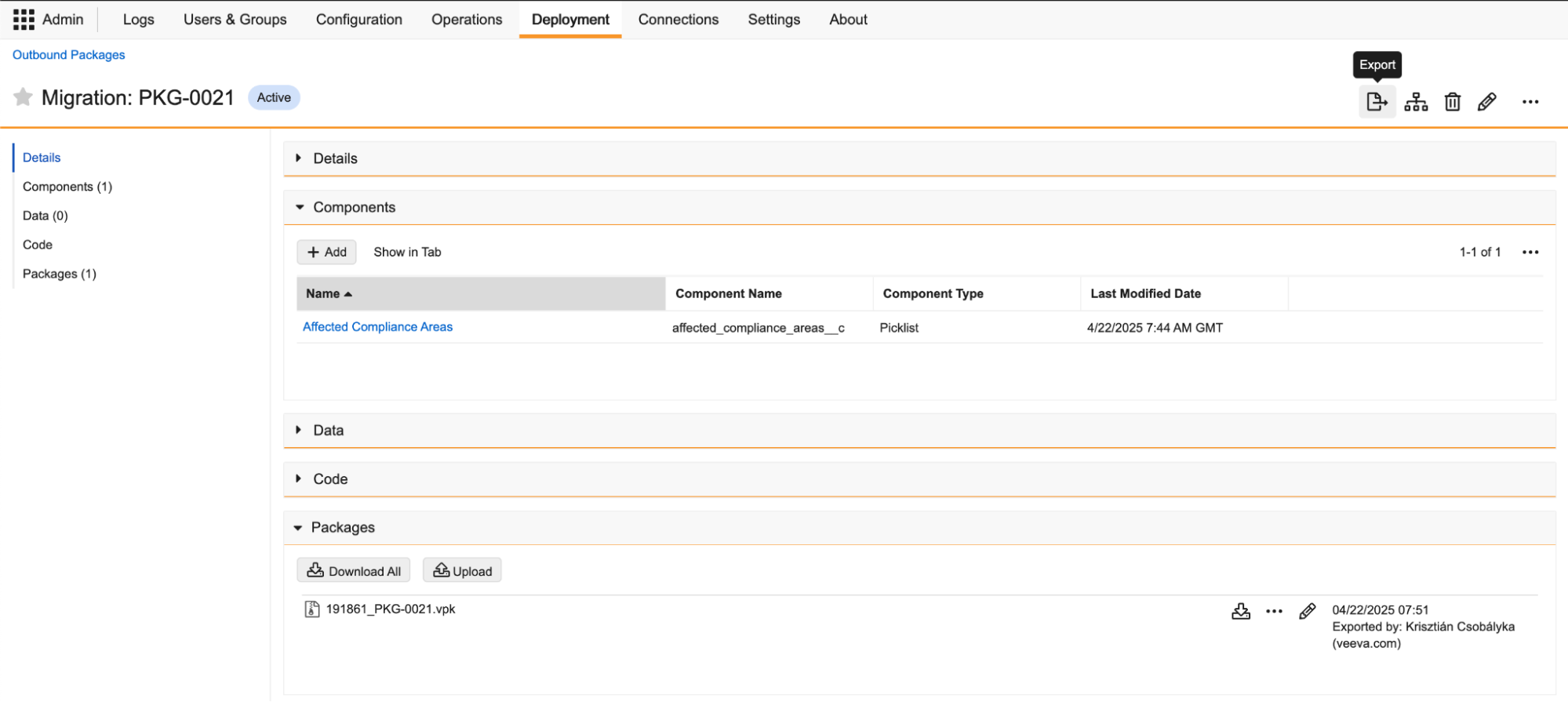If this change has been executed in a sandbox environment, you must use migration packages to replicate configuration changes in your production environment. Learn more about using configuration migration packages in Vault Help.