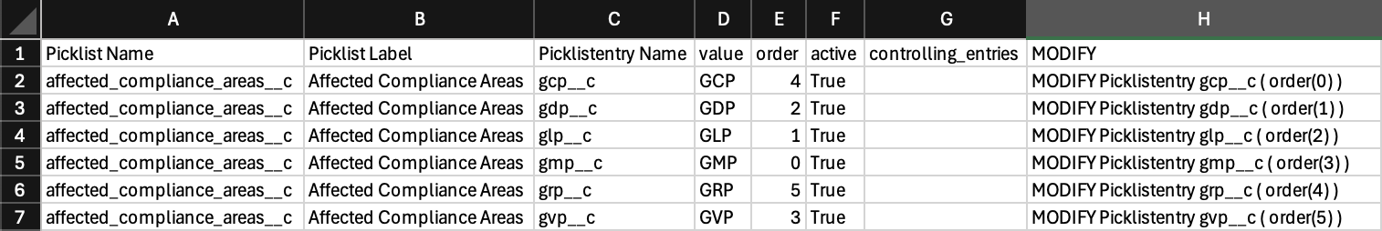 In a new column, add a formula that will construct the MODIFY commands to change the order() attribute of the Picklistentry sub-components.
