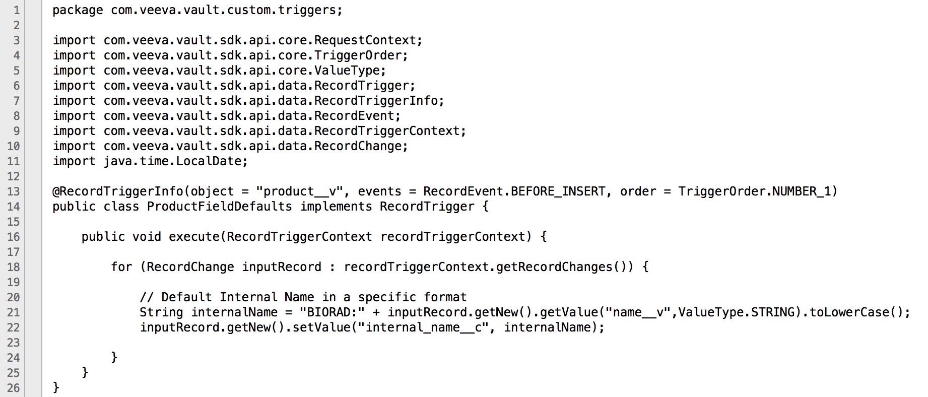 Section link for Line #1: PackageA custom record trigger must be under the com.veeva.vault.custom package. You can have further sub-package names as you see fit to organize your triggers. For example, you might use com.veeva.vault.custom.rim.submissions.triggers to indicate custom triggers for a RIM Submissions project.