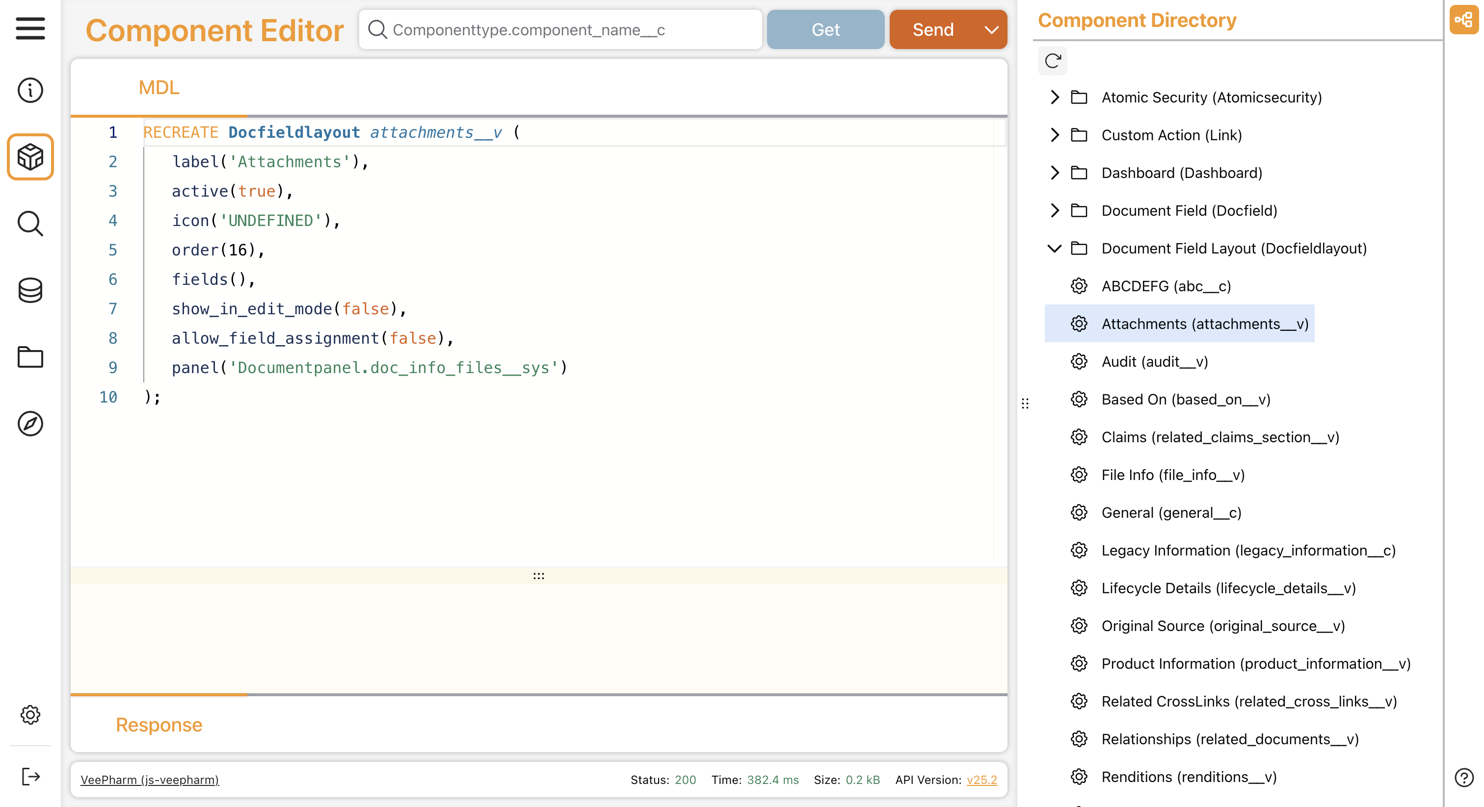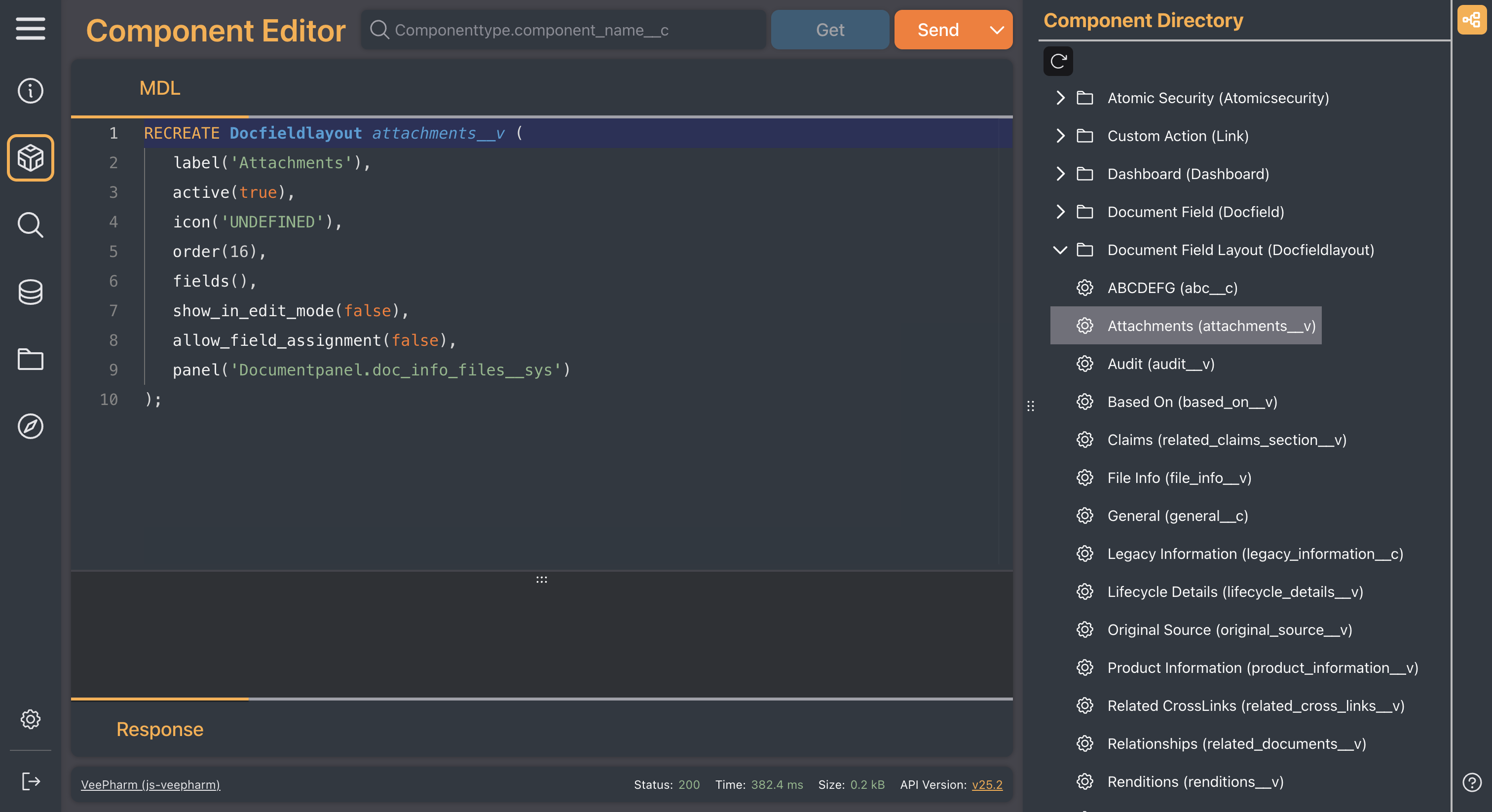 Vault Toolbox includes a Component Editor that allows you to view the Metadata Definition Language (MDL) of components in your Vault. In sandbox Vaults, you can also execute MDL commands directly from the Component Editor to Vault, allowing you to quickly test configuration changes. See the MDL Overview to learn more about MDL commands.